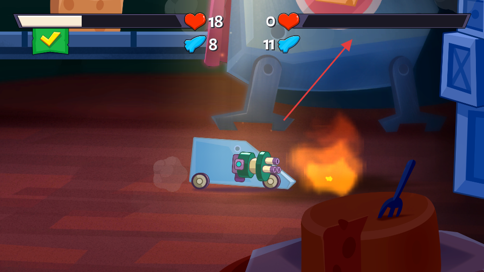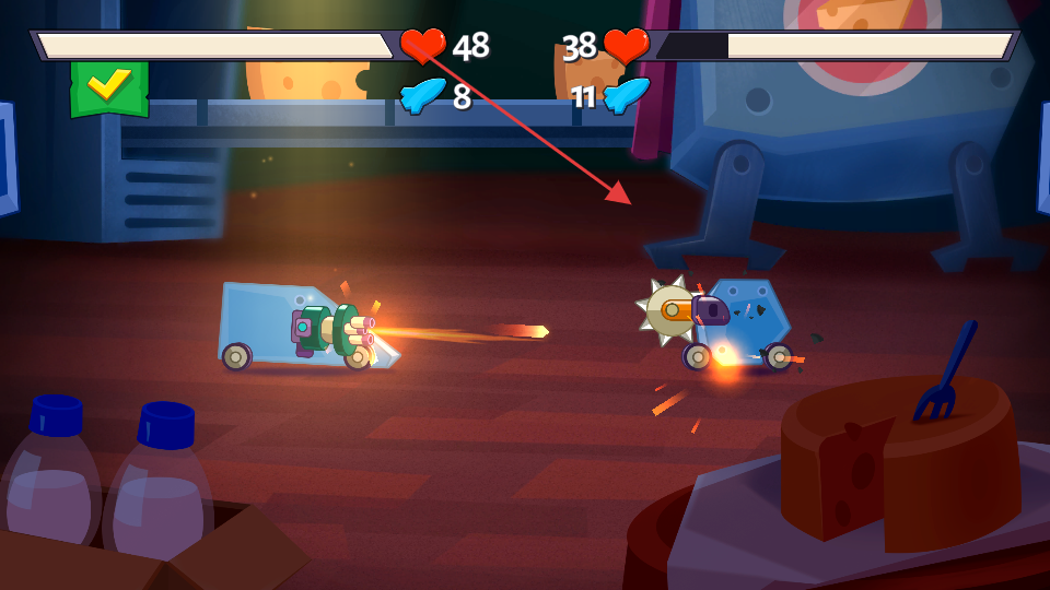 2、战斗开始后操控己方汽车上的武器比如发射子弹等攻击方式,对敌方汽车进行攻击,降低敌方汽车的生命值红心标识。