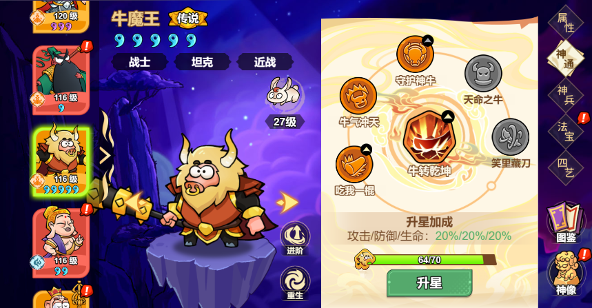 1、升星需收集牛魔王碎片,可通过招募、灵音幻境白嫖获取;进阶神话解锁更强属性,60级开全装备位,武器、防具等分别加成生命、防御,平民也能稳步养成。