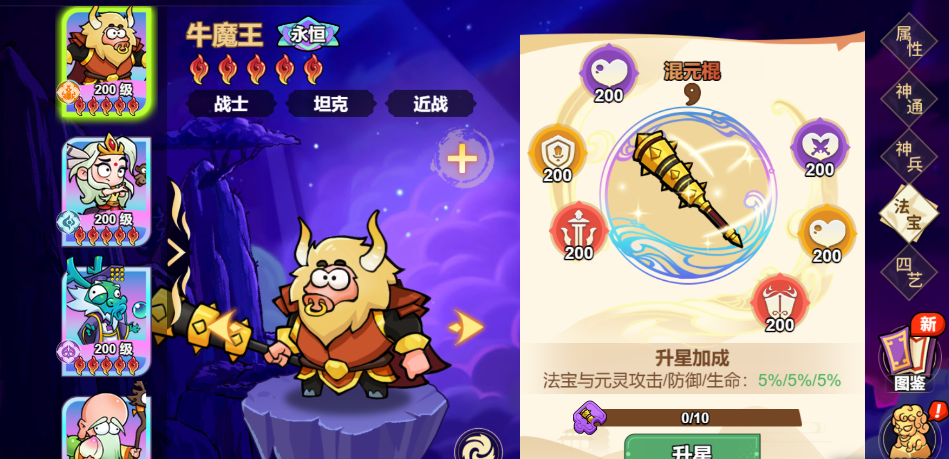 2、法宝「混元棍」可强化生命、防御、攻击与减伤,随等级解锁词条;优先堆生命、防御元灵,提升坦度;搭配反击套、防御套披挂,放大抗伤能力。