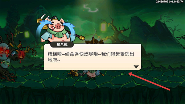 1、了解剧情,猪八戒提示续命香快燃尽需赶紧逃出地府,开启西游地府的逃离冒险旅程。