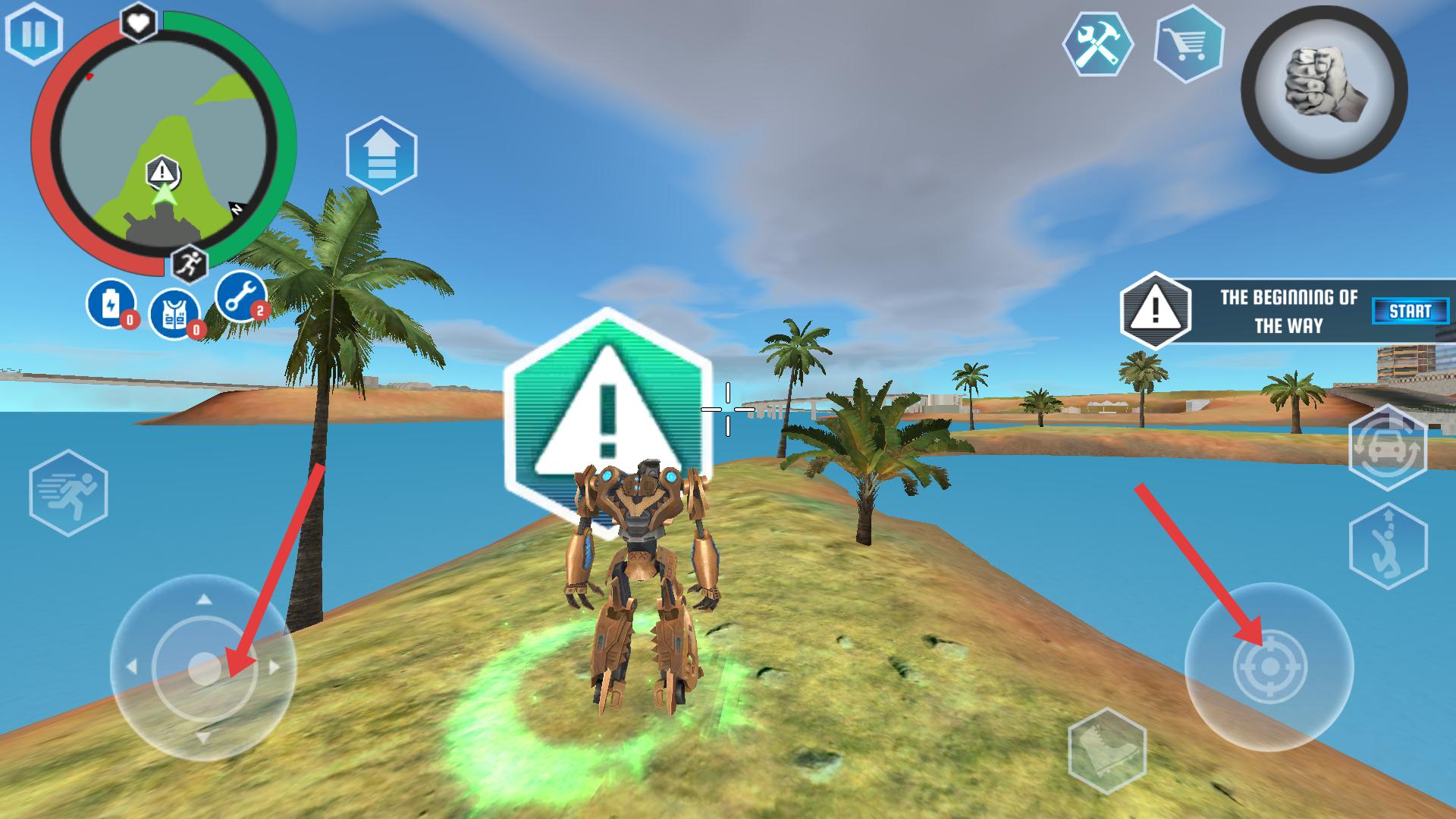 3、在游戏场景中通过左侧摇杆移动机器人,右侧射击按钮进行攻击,完成THEBEGINNINGOFTHEWAY任务。