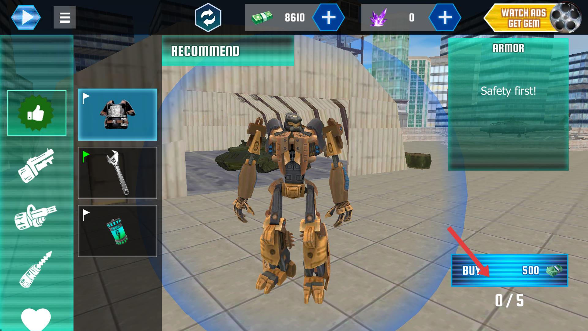 2、点击BUY按钮,花费500货币购买推荐的装甲,提升机器人的防御能力,遵循Safetyfirst的提示。