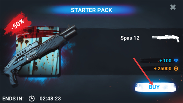 2、在新手礼包界面点击BUY按钮,购买包含Spas12的礼包,获取钻石和金币奖励。
