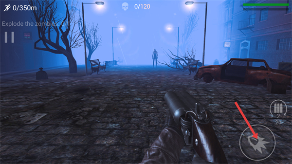 4、在战斗中点击右侧射击按钮,使用武器攻击僵尸,完成Explodethezombies的任务目标。